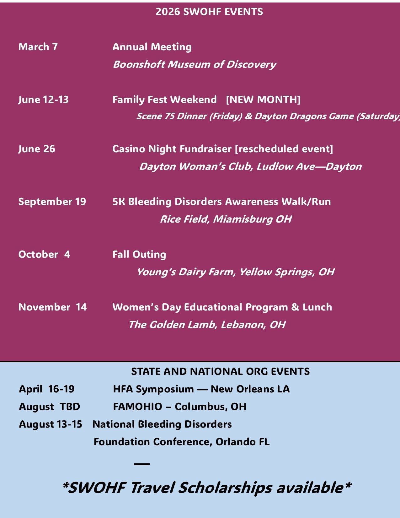 Our SWOHF 2026 Calendar is currently being finalized! Here's a glimpse at our programs and events. More info will be posted as event details are confirmed.